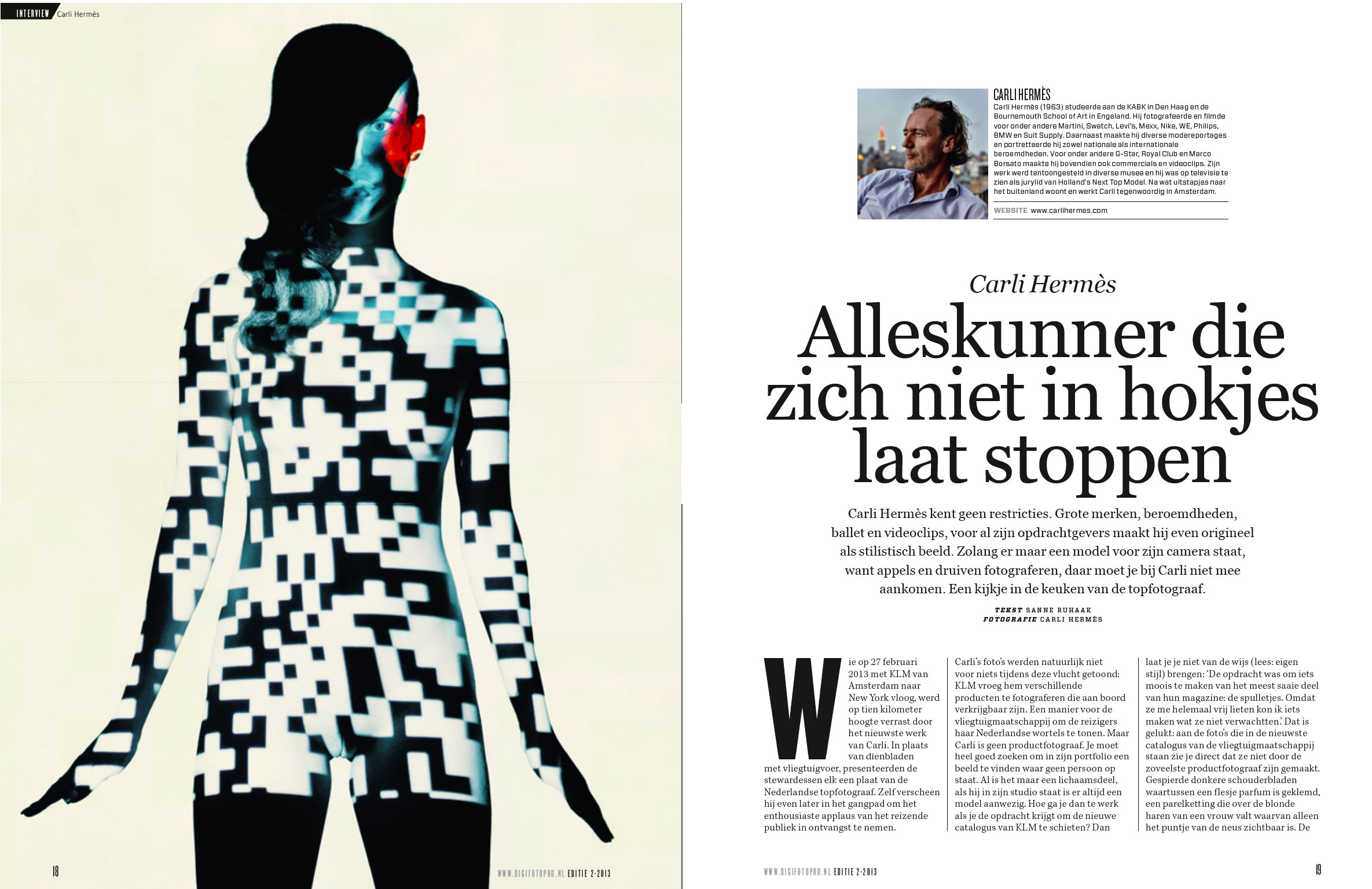 Carli Hermès kent geen restricties. Grote merken, beroemdheden, ballet en videoclips, voor al zijn opdrachtgevers maakt hij even origineel als stilistisch beeld. Zolang er maar een model voor zijn camera staat, want appels en druiven fotograferen, daar moet je bij Carli niet mee aankomen. Een kijkje in de keuken van de topfotograaf.