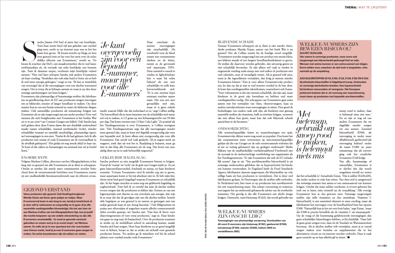 Nieuw in het gezond-en-puur-evangelie: eten zonder E-nummers, de stoffen die zorgen voor de mooi, de lekker en de houdbaarheid. Verstandig, of de zoveelste voedselobsessie? ‘alle E-ummers in één klap uit de weg gaan, is behoorlijk ongezond.’
