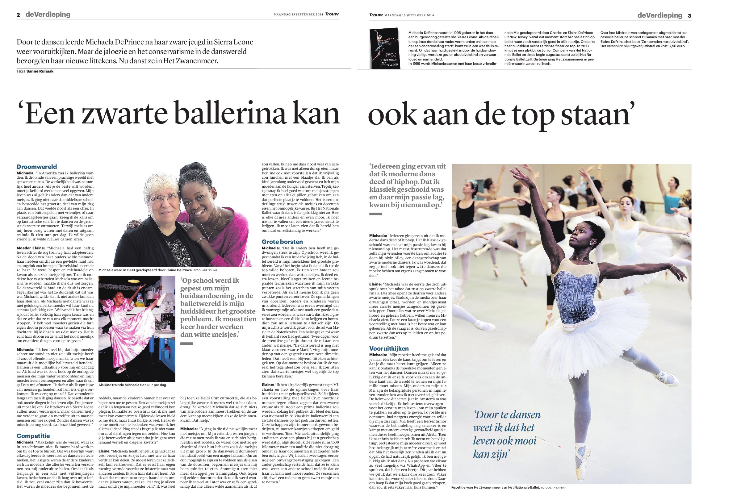 Trouw – De Verdieping. Door te dansen leerde Michaela DePrince na haar zware jeugd in Sierra Leone weer vooruitkijken. Maar de jaloezie en het conservatisme in de danswereld bezorgden haar nieuwe littekens. Nu danst ze in Het Zwanenmeer.